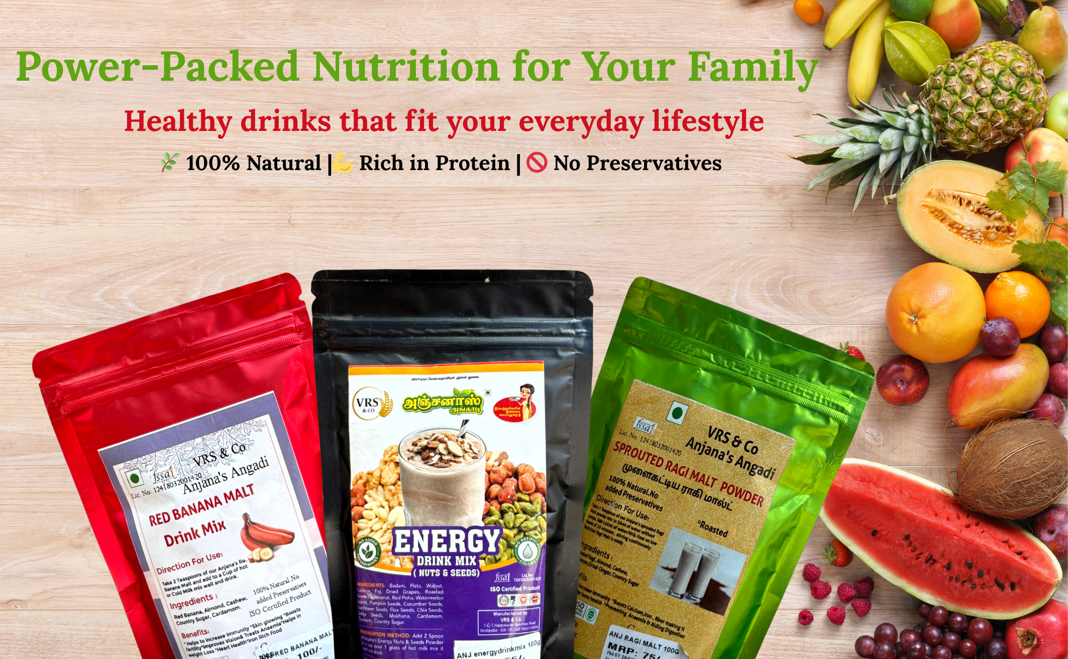 At Vrsanjanas, we believe that health and taste go hand in hand. From traditional spice powders to nutritious health mixes, every product is made with handpicked ingredients and time-tested recipes.Our masalas bring authentic flavors to your cooking, while our health mixes provide the daily nutrition your family deserves. Each pack is carefully crafted without preservatives, ensuring purity, freshness, and quality in every spoonful.Whether it’s enhancing your favorite dish with rich, aromatic spices or enjoying a wholesome drink with our malt and millet mixes, Vrsanjanas is your trusted partner in the kitchen. With us, you don’t just cook—you create healthy, flavorful moments every day.